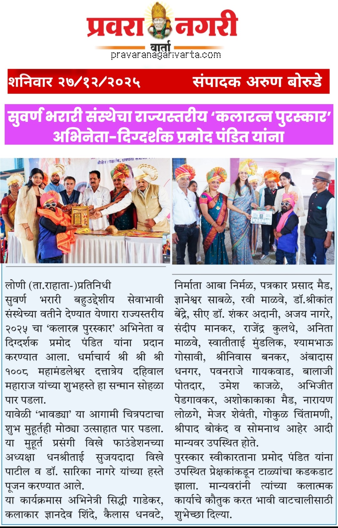 सुवर्ण भरारी संस्थेचा राज्यस्तरीय ‘कलारत्न पुरस्कार’ अभिनेता-दिग्दर्शक प्रमोद पंडित यांना