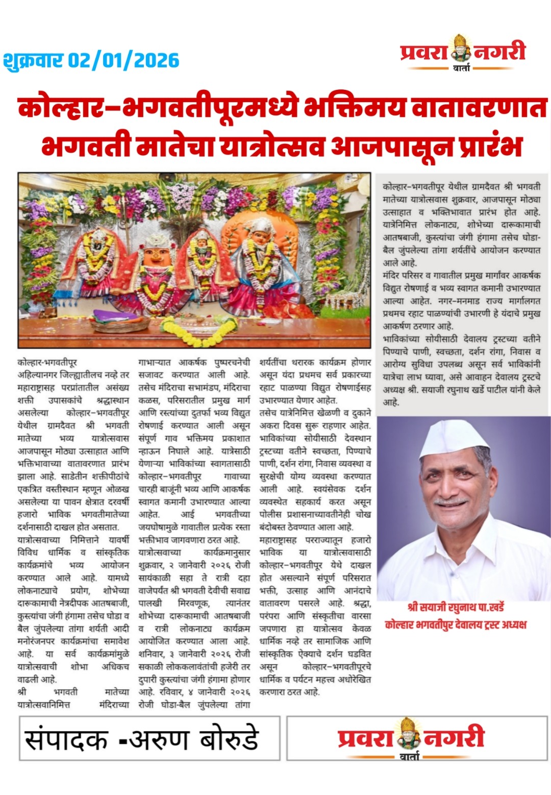 महाराष्ट्रातील एकमेव साडेतीन शक्तीपीठांचे जागृत वस्तीस्थान; कोल्हार भगवतीदेवी चा भव्य यात्रोत्सव भक्तिभावात २ जानेवारीपासून सुरू होणार