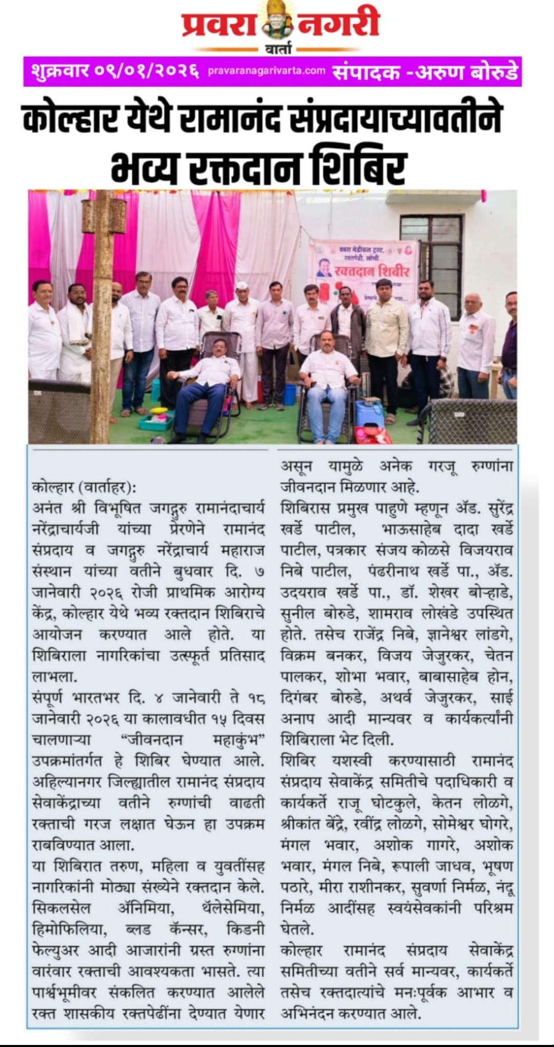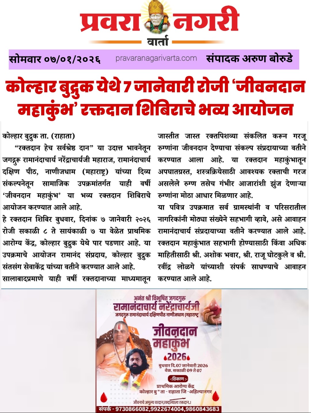 कोल्हार बुद्रुक येथे ७ जानेवारी रोजी ‘जीवनदान महाकुंभ’ रक्तदान शिबिराचे भव्य आयोजन