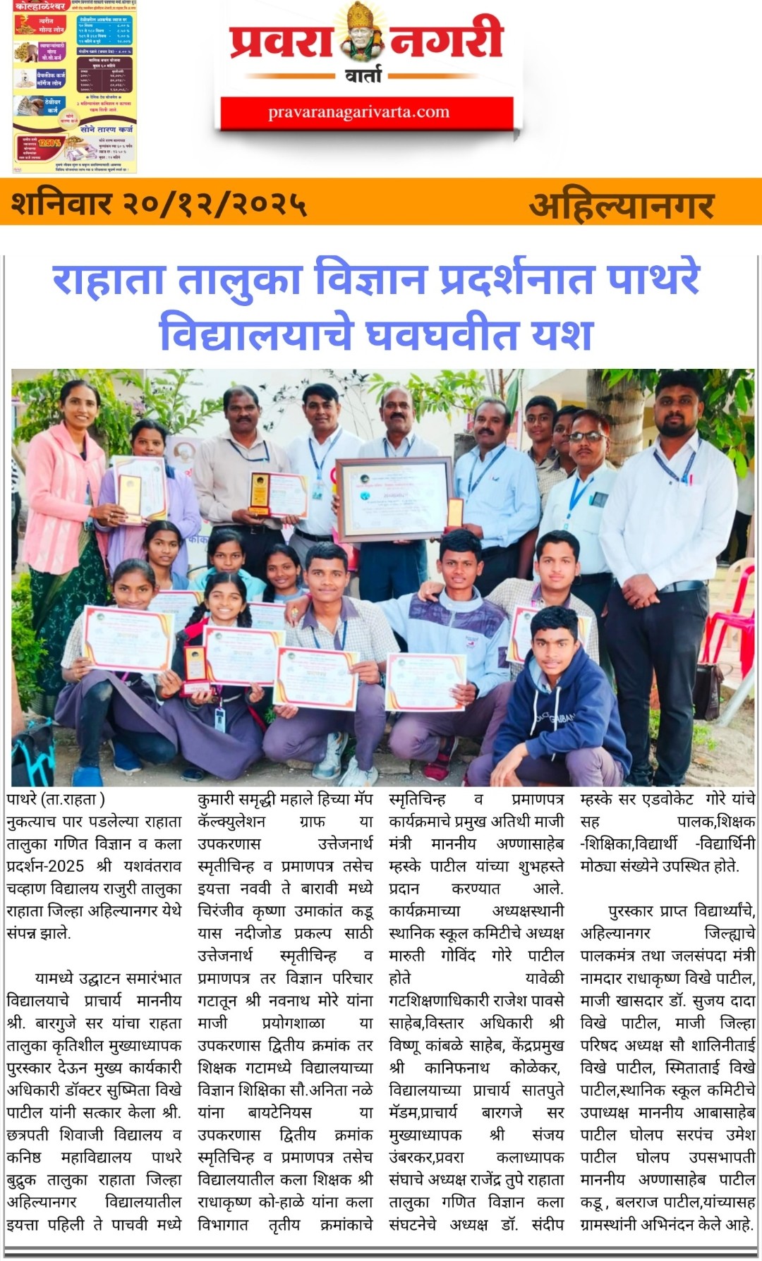 राहाता तालुका विज्ञान प्रदर्शनात पाथरे विद्यालयाचे घवघवीत यश