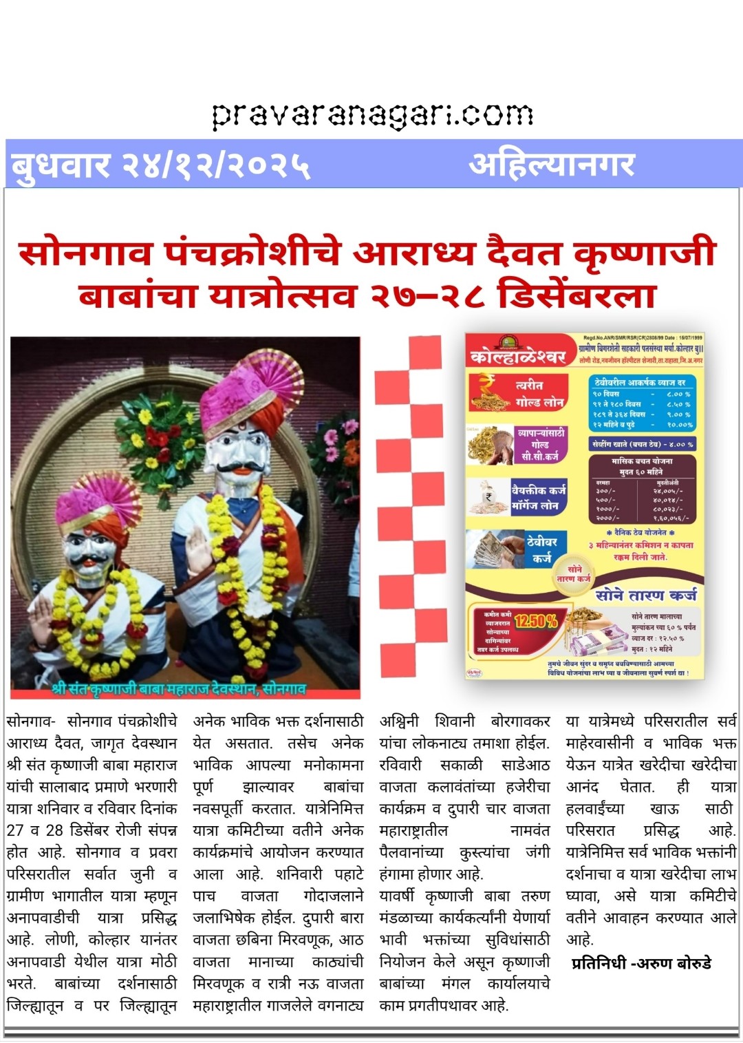सोनगाव पंचक्रोशीचे आराध्य दैवत कृष्णाजी बाबांचा यात्रोत्सव २७–२८ डिसेंबरला